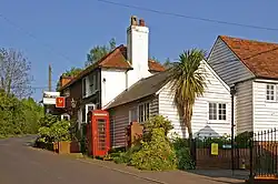 The hamlet consists of several small cross roads on minor country roads which are mostly without street lighting or pavement and some are single track for a length and lined with trees. There are many detached houses with fairly large gardens, scattered with trees, a public house and a small church; further out there are several farms with many fields, and larger, denser woodland.