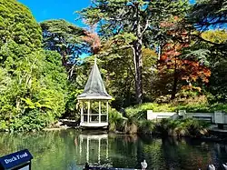 The duck pond is a naturally-formed pond, fed by the Pukatea and Pipitea streams, and has been a feature of the Botanic Garden since 1868. In times past it was known as the Frog Pond, the Lily Pond and the Swan Pond.[16] In 1996 the pond was enlarged and reshaped, and its surroundings were upgraded with a small pavilion, wetland garden and lookout points.[30] In 1998, landscape architect Stephen Dunn of Boffa Miskell won a silver award for his redesign of the pond, in a competition held by the New Zealand Institute of Landscape Architects and the Landscape Industries Association of New Zealand.[31]