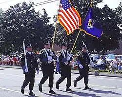 Wells celebrated its 350th anniversary in 2003.[7] The year-long celebration included a New Year's Eve party with fireworks, parade, a visit by the traveling Russian circus, concerts, historical reenactments, and more. The town commissioned a member of the celebration committee, Kristi Borst, to design a town flag. Her design portrays historic aspects of the Town's settlement and agriculture as well as the 2003 Town Hall and focus on tourism represented by a train. Also included is the motto she penned for the project: "Proud of our Past, Ready for our Future".[8]