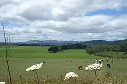 Initial industry at Whakapirau was dominated by the timber trade, and in 1864 Nicholson's timber mill was established on the southern banks of the Ōruawharo River. Kauri gum diggers' camps were established across the area in the 1870s, including a 500 acres (200 ha) area called the Wayby Kauri Gum Reserve that was set aside for the practice. The modern Wellsford township site was also dug for kauri gum, and was often referred to as The Gum Ridge.[12] Members of Te Uri-o-Hau traded and intermingled with the Alberton settlers.[16] The settlement's modern name, Wellsford, was likely adopted in the early 1870s.[7] Wellsford would move eastwards over time to its current location.[18]