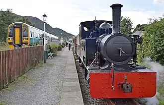 Bagnall 3050 Gelert at Porthmadog alongside a Cambrian line train