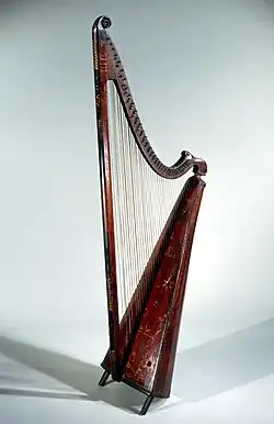The instrument most commonly associated with Wales is the harp, which is generally considered to be the country's national instrument.[5] Though it originated in Italy, the triple harp (telyn deires, "three-row harp") is held up as the traditional harp of Wales: it has three rows of strings, with every semitone separately represented, while modern concert harps use a pedal system to change key by stopping the relevant strings. After losing ground to the pedal harp in the 19th century, it has been re-popularised through the efforts of Nansi Richards, Llio Rhydderch and Robin Huw Bowen. The penillion are a traditional form of Welsh singing poetry, accompanied by the harp, in which the singer and harpist follow different melodies so that the stressed syllables of the poem coincide with accented beats of the harp melody.[6]