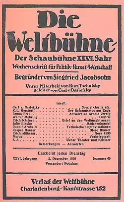 {{cite book}}: CS1 maint: location missing publisher (link) - ^ Gallus, Alexander (2012). Heimat Weltbühne. Eine Intellektuellengeschichte im 20. Jahrhundert [Homeland Weltbühne. A History of Intellectuals in the 20th Century] (in German). Göttingen: Wallstein. p. 212. ISBN 978-3-8353-1117-6.