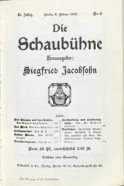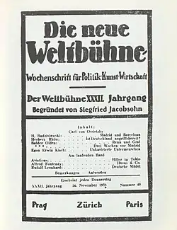 Die Weltbühne (French pronunciation: [diː ˈvɛltˌbyːnə], ‘The World Stage’) was a German weekly magazine for politics, art and the economy. It was founded in Berlin in 1905 as Die Schaubühne (‘The Theater’) by Siegfried Jacobsohn and was originally a theater magazine only. In 1913 it began covering economic and political topics and for the next two decades was one of the leading periodicals of Germany’s political left. It was renamed to Die Weltbühne on 4 April 1918. After Jacobsohn's death in December 1926, leadership of the magazine passed to Kurt Tucholsky, who turned it over to Carl von Ossietzky in May of 1927. The Nazi Party banned the publication shortly after it came to power, and the magazine's last issue appeared on 7 March 1933. It continued from exile as Die neue Weltbühne (‘The New World Stage’) until 1939. After the end of World War II, it appeared again under its original name in East Berlin, where it survived until 1993. The magazines Ossietzky (since 1997) and Das Blättchen (‘The Leaflet’, 1998) have followed in the tradition of their famous role model.