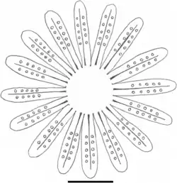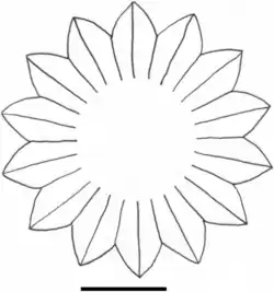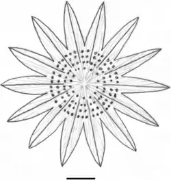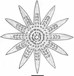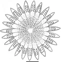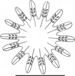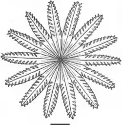 Although the morphology of Weltrichia is highly variable, the overall morphology consists of a central cup-like structure surrounded by a number of radially symmetrical outward projecting rays, to which are attached bivalve-shaped pollen sacs/synangia. The number of rays varies from 9/10 to 30, depending on the species, and the total diameter from 3 centimetres (1.2 in) to over 20 centimetres (7.9 in). Both the cup and rays usually (but not always) have substantial thickness, in some of the thicker species the structure is noticeably woody. The pollen is monocolpate and elliptical. In some species, additional rays project over the central cup, and attractants/resinous substances are present within the cup. The rays also sometimes have ridges, trichomes, appendages, striae and/or unipinnate (pedicellate) pollen sacs present. Species of Weltrichia appear to have primarily been wind pollinated, though some species may have been pollinated by insects, such as beetles. They were borne by the same plants that also bore female ovulate cones assigned to Williamsonia.[1] It is unclear whether the parent plants were monoecious (having both structures on one plant) or dioecious (where each plant only has one gender of reproductive organ). At least some bearers of Weltrichia, such as Kimuriella from the Late Jurassic of Japan were low growing divaricately branching shrubs with a maximum height of 2–3 metres, while others such as Williamsonia gigas may have been more cycad-like in morphology.[2]