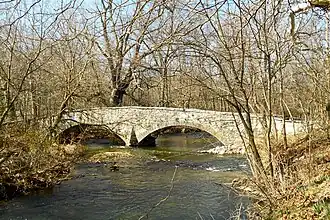 This historic structure is a 137-foot-long (42 m), two-arch bridge that was built in 1856 using limestone. It crosses the East Branch of Little Antietam.[2]