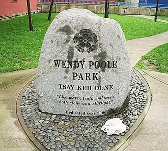 A coalition of First Nations, community groups, and individuals from the DTES campaigned, along with Roslyn Cassells, the then Party Commissioner of the Green Party of Canada, to name this small waterfront park after Wendy Poole. The proponents of the proposal hoped that the park would bring awareness to the unsolved cases of the missing women in the Downtown Eastside, and contribute to a healing process with First Nations people in the city.[4]