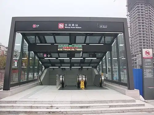 Wenze Road (Chinese: 文泽路) is a station on Line 1 of the Hangzhou Metro in China.[1][2] It was opened in November 2012, together with the rest of the stations on Line 1. It is located in the Qiantang District of Hangzhou.