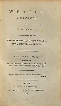 Werter is a 1785 tragedy by the British writer Frederick Reynolds. His debut play, it was inspired by the 1774 novel The Sorrows of Young Werther by Johann Wolfgang von Goethe. It first appeared at the Theatre Royal, Bath on 25 November 1785. Its London premiere came at the Theatre Royal, Covent Garden on 14 March 1786.[1] The original Covent Garden cast included Joseph George Holman as Werter, William Davies as Sebastian, James Fearon as Leuthrop, William Farren as Albert and Ann Brunton as Charlotte.[2] The Dublin premiere was at the Smock Alley Theatre on 2 December 1786.[3]