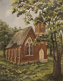 Built of brick on a stone foundation,[3] the church features a distinctive pyramid-shaped roof above the 1888 addition. At one time, the church also included a tower above the entrance; the tower was the portion of the building hit by the 1926 lightning strike, and it was removed as a result.[2] The various architectural elements combine to form a building that is distinctively in the Gothic Revival style.[1]