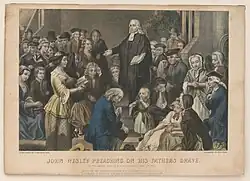 Wesley was unhappy about the idea of field preaching as he believed Anglican liturgy had much to offer in its practice. Earlier in his life he would have thought that such a method of saving souls was "almost a sin."[48] He recognised the open-air services were successful in reaching men and women who would not enter most churches. From then on he took the opportunities to preach wherever an assembly could be brought together, more than once using his father's tombstone at Epworth as a pulpit.[49][50] Wesley preached to create repentance, prayed for conversion, dealt with hysterical behaviour, and preached to upwards of thousands through field preaching.[43] Wesley continued for fifty years—entering churches when he was invited, and taking his stand in the fields, in halls, cottages, and chapels, when the churches would not receive him.[49]