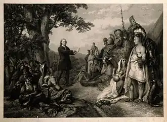 Wesley arrived in the colony in February 1736, and lived for a year at the parsonage that stood on the site of today's Oliver Sturges House.[24] He approached the Georgia mission as a High churchman, seeing it as an opportunity to revive "primitive Christianity" in a primitive environment.[25] Although his primary goal was to evangelise the Native American people, a shortage of clergy in the colony largely limited his ministry to European settlers in Savannah. While his ministry has often been judged to have been a failure in comparison to his later success as a leader in the Evangelical Revival, Wesley gathered around him a group of devoted Christians, who met in a number of small group religious societies. At the same time, attendance at Communion increased over the course of nearly two years in which he served as Christ Church's parish priest.[26]