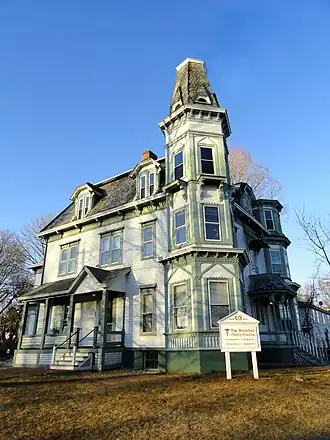 The district was enlarged in 2006 to include a residential and industrial area south of the center, primarily along Milk, Front, and Ware Streets. This area was developed largely after the arrival of the railroad in 1839. It is composed mainly of residential structures dating from that time to the early 20th century, although it does include a cluster of fairly nondescript 19th century railroad-related buildings, as well as two passenger depots: a Gothic Revival structure built between 1839 and 1847, and a Richardsonian Romanesque passenger station built in 1884 to a design by Springfield architect Eugene C. Gardner that was strongly influenced by those of H. H. Richardson, who had designed other depots for the Boston and Albany Railroad.[3] The earlier station is among the oldest purpose-built railroad stations still standing in the United States.[4]