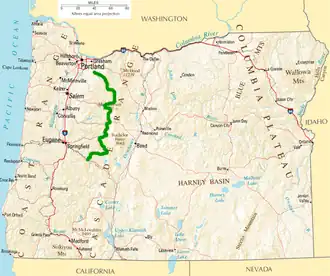 The route is roughly north–south, from Estacada, southeast of Portland to Oakridge on the Willamette River southeast of Eugene. Much of the route is very sparsely populated, passing through timber regions in the Cascades.