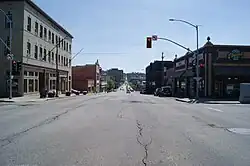 The Spokane River gorge is the dominant physical feature of the neighborhood and serves as its southern, western and northwestern boundary as the river winds its way downstream in a generally northwesterly direction away from Downtown Spokane. The terrain falls off dramatically from the largely flat plain of West Central more than 200 feet down to the river.[3] The river separates West Central from the neighborhoods of Peaceful Valley on the south and West Hills on the west. Monroe Street, a major north–south thoroughfare and commercial district, serves as the eastern border of the neighborhood, beyond which lie the neighborhoods of Riverside and Emerson/Garfield. Indiana, an east–west thoroughfare, separates West Central from Emerson/Garfield on the north.