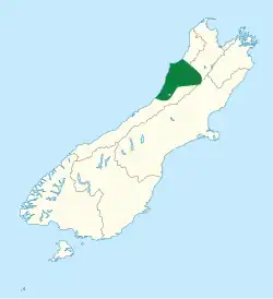 | Distribution of the West Coast green gecko on a map of the South Island Known native range