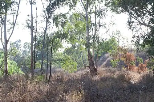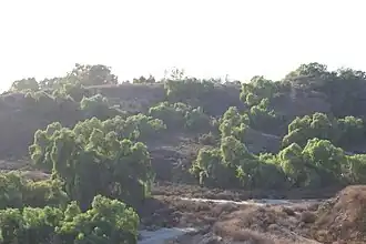 The undeveloped areas of Coyote Hills are vegetated with coastal sage scrub.[11][12] Native species include buckwheat and prickly pear. Nonnative plants include pepper trees, tobacco trees, and mustard. There are no creeks, except for ephemeral freshets after storms, and no native riparian species such as oaks. Mature eucalyptus trees and some pine trees grow along some of the fence lines, where the area abuts housing tracts and the city's trail system.