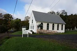 West Delhi Presbyterian Church, Manse, and Cemetery is a historic Presbyterian church complex and cemetery at 18 and 45 Sutherland Road in West Delhi, Delaware County, New York. The church is a one-story, rectangular wood-frame building constructed in 1892. It is surmounted by a steep gable roof with overhanging eaves. The manse was built about 1840 and is a large two story wood-frame building with a cross gable plan. The West Delhi Cemetery contains the graves of most settlement era families and features stones typical of their period and style.[2]
