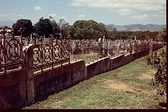 Large banyan, fig and mango trees are the main plantings. An avenue of mahogany trees, running north–south from the adjacent recreation reserve, marks the original entrance off the end of Pridmore Street. There is an early perimeter fence of rendered masonry with cast iron panels along the Church Street boundary, with the roots of mature banyans grown over the fence and nearby graves. The main entrance, off Church Street, appears to have been constructed at the same time as the fence.[1]