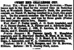 The club's last FA Cup tie was a 3–3 draw with Upton Park in 1884–85 as it withdrew from the competition before the replay. It had success on a more local level, winning the West End Challenge Cup (set up in 1881 for works sides from "large retail houses")[4] for the first time in 1882–83, by beating Prairie Rangers (the works side of Harvey Nichols)[5] 3–0 in the final replay, at Wormholt Farm; the match attracted an attendance of 1,500, and Cooper gave West End the lead in the first half, Foster scoring twice in the second (the first from following up a parry by Houghton in the Rangers' goal, the second "breasting" home a corner) to secure the cup.[6] It repeated the triumph in 1895.[7]