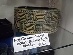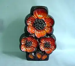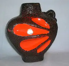 The terms Fat Lava and West German Art Pottery are often used interchangeably, but technically have a different meaning. Fat Lava refers specifically to a type of thick glazes that gives the object a thick lava-like look. This type of glaze was commonly used in this period by German pottery manufacturers. The term Fat Lava itself though is of a much more recent date. It has been suggested that the term Fat Lava first emerged with an exhibition curated by Graham Cooley during the King's Lynn Arts Festival in 2006, but the term was actually being used by sellers in Germany at least a decade earlier and may actually be due to a slightly faulty computer translation that came up with "fat" when the more accurate term would be "thick". The precise origin is likely to remain uncertain, but it definitely predates the Fat Lava exhibition and related catalog.