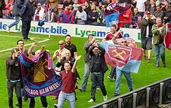 West Ham United F.C. supporters, commonly known as Hammers, are the followers of the London-based West Ham United Football Club, who were founded as Thames Ironworks in 1895. There are 700,000 fans on the club's database and over 2,300,000 likes on Facebook.[1] The club's website is in the top ten most visited websites for English football clubs by people in the USA.[2] Their fans are also associated with a once-notorious hooligan element[3] and have long-standing rivalries with several other clubs, most notably Millwall.