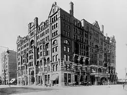 Opened in 1884, the West Hotel was Minneapolis's first grand hotel. It had 407 luxuriously furnished rooms, 140 baths, and featured an immense and opulent lobby which was claimed to be the largest in the nation. These elements combined to make what was considered for a time to be the most luxurious hotel west of Chicago. The West was designed by LeRoy Buffington and built on land that was once owned by the first resident of Minneapolis, John H. Stevens. Buffington created the West in the Queen Anne style that was quite popular in the last decades of the 19th century.