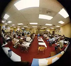 All academic classrooms were housed within an innovative floorplan design, with each of the three circular wings arranged and interconnected in the shape of a triangle. New to Central Florida high schools at the time, all classrooms and common areas were located within one contiguous building complex so that the weather did not affect the school day. The lunchroom "commons," as well as the library media center and auditorium, were designed to be located centrally within the complex. The band room, gym, and industrial arts wings, as well as the science building, were located along the periphery of the complex. Designed in the aftermath of the 1973 energy crisis, the architectural design also called for a minimum of windows to maximize energy efficiency, as the building was 100% air-conditioned. Large portions of the building were also designed with removable partitions to allow for easy re-configuration as classroom size changed. Also contemporary with the 1970s, nearly all floors were carpeted and many of the interior walls were either covered with carpet or high-grade vinyl wall texturing. In the campus' final years, however, the building interior has been modified, removing most of the carpeting on the walls and floors.