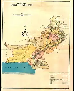 West Pakistan was the western province of Pakistan between 1955 and 1970, covering the territory of present-day Pakistan.[1] Its land borders were with Afghanistan, India and Iran, with a maritime border with Oman in the Gulf of Oman in the Arabian Sea.