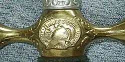 At some time after 1922, the West Point sword was modified to carry the seal of the Academy representing the Athenian helmet of Greek mythology, reflecting the adoption of this into the Academy's coat of arms, instead of the letters "MA" on its guard. The seal as adopted about the turn of the 20th century was designed with the classical helmet facing sinister (to the heraldic left or viewer's right). In 1922 it was pointed out that this was counter to the best heraldic usage which places the greater honor on the dexter side (the heraldic right or viewer's left). The helmet was then turned to face dexter. All swords bearing the crest that have been examined have had the helmet facing dexter. The earliest examples of these are well made with brass grips. The straight blade is double-edged with a wide central fuller on both sides running from the ricasso to within 8 inches of the point. It is etched on the obverse side of the blade "U.S.M.A." The hilt resembles that on the previous specimen except for the changes in the proportions of the elements, the use of white metal for the grips, and the use of the seal instead of the letters "MA" on the guard. The scabbard is exactly the same except that the body is chrome plated.[16]