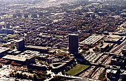 White flight and blockbusting drastically changed the demographics of the West Side by the 1950s. Throughout this decade, many white Chicagoans moved to the suburbs in a planned move by investors who, through scare tactics and instigating racial antagonism, encouraged white Chicagoans to sell their city homes and buy homes the investors built in the suburbs.[37] By 1960, Chicago recorded its first ever population drop. However, Black and Latino residents began filling the West Side to its maximum. Black areas of the West Side began to experience highly impoverished conditions moving into the 1960s. Many residents moved into housing projects that were built throughout the West Side the previous decade, the main housing projects being ABLA and Henry Horner Homes in the Near West Side, Rockwell Gardens and Harrison Courts in East Garfield Park, and Lawndale Gardens in Lawndale/Little Village. Many of these housing projects became predominantly Black and poor.[38] The Chicago Housing Authority was known for its segregationist policies and lack of building maintenance,[39] and police brutality was very frequent.[40] After the assassination of Martin Luther King Jr. on April 4, 1968, the Blacks of the West Side rebelled in anger against the oppressive system made more apparent by King's murder. Long stretches of businesses along Madison Street in Garfield Park and Austin and along Roosevelt Road in Lawndale, the majority of which were owned by whites, were looted and burned down. Mayor Daley ordered 10,500 police and 6,700 National Guardsmen into the West Side, ordering "to shoot to kill any arsonist or anyone with a Molotov cocktail in his hand... and... to shoot to maim or cripple anyone looting any stores in our city."[41]