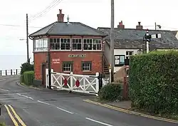 The platform at Dunster is on the right while the old goods yard on the left is now used by the WSR's civil engineering team who keep the tracks in good order.[5] On leaving the station is another level crossing, this time over Sea Lane that leads down to Dunster Beach which can be glimpsed to the left of the train. A footpath leads from the east end of the platform down to Sea Lane to save a long walk round along the road. The line then continues across the concrete channel of the River Avill onto Ker Moor and along the edge of the beach[26] to reach Blue Anchor, 3.5 miles (5.6 km) from Minehead and the first passing loop. Approaching the station, the old goods yard is on the right[4] and three camp coaches are kept here where volunteers working on the railway can stay overnight. At the western end of the platform, a signal box overlooks a level crossing on the road from Blue Anchor to Carhampton. The West Somerset Steam Railway Trust's museum is on the right-hand platform.[5]