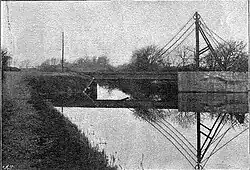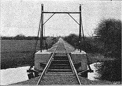 I am able to supply a unique photograph of an incident that happened during the construction of the line owing to this canal. The engine had been brought down to Chichester and was much wanted on the other side of the canal, but as the bridge was not completed for traffic it was impossible to cross. The little locomotive, therefore, had to perform a slow and circuitous journey by road of over 3 miles (4.8 km), being hauled by a traction engine on rails, simply placed down on the road in front of the railway engine and taken up from behind it alternately.[3]