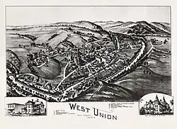 West Union, incorporated July 20, 1881, is a town and the county seat of Doddridge County, West Virginia, United States.[5] The population was 669 at the 2020 census.[2] The town is located along Middle Island Creek at the junction of U.S. Route 50 and West Virginia Route 18; the North Bend Rail Trail also passes through the town.[6]