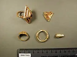 The hoard contains four gold finger-rings, a fragment of gold cloisonné jewellery, a piece of gold ingot, along with a lead spindle whorl.[4] The 2008 finds were found in three batches across two days and were a finger-ring set with a garnet, a finger-ring with an enlarged bezel, a finger-ring inlaid with niello, a partial gold ingot and a fragment of cloisonné.[5] The 2009 finds were a gold finger-ring with a round bezel, filigree and granulated decoration, as well as a lead disc, most likely a spindle whorl.[6]