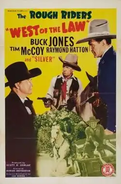 West of the Law is a 1942 American Western film directed by Howard Bretherton and written by Adele Buffington. This is the eighth film in Monogram Pictures' Rough Riders series, and stars Buck Jones as Marshal Buck Roberts, Tim McCoy as Marshal Tim McCall and Raymond Hatton as Marshal Sandy Hopkins, with Evelyn Cook, Harry Woods and Jack Daley. The film was released on October 2, 1942, by Monogram Pictures.[1][2][3]