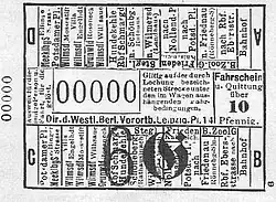 A staggered partial route fare of 10, 15 and 20 pfennigs applied to domestic services on the Westliche Berliner Vorortbahn. The sections were designed so that a fare of 10 pfennigs applied for journeys within the area bounded by Stadtbahn and Ringbahn. The inland fare was applied on most lines. Line G to Stettiner Bahnhof was operated in connecting service with the GBS, the fare applicable here was also graduated according to distance in 10, 15 and 20 Pfennig.[16][17]