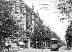 In addition to the lines mentioned above, there were other sections of line owned by the WBV that were used exclusively by third-party railroads. The line from Kaisereiche to the corner of Rubensstrasse and Casanovastrasse, which opened on September 1, 1905, was owned by the WBV on Friedenau territory.[11][12] On May 27, 1907, a line through Pariser Straße between Kaiserallee and Uhlandstraße went into operation. On November 27, 1911, this connection was extended beyond Olivaer Platz to Xantener Straße. The line was used exclusively by GBS lines.[5] The route through the Südwestkorso opened on May 15, 1911, served line O of the Berlin-Charlottenburg Tramway (BCS).[13] In the nearby Nestorstraße there was a service line to serve the Betriebshof XIII of the GBS.[14]