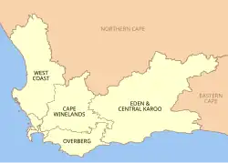 The Western Cape is divided into eight education districts; four are "rural" districts which correspond to one or more district municipalities, while the other four are "urban" or "Metro" districts within the City of Cape Town. The districts are: