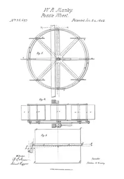 At the end of 1865 Benner and Brown sold Western Metropolis to the Ruger Brothers for their new North American Lloyd Line.[42] Advertising began immediately for a March 17, 1866 departure to Bremen, Germany with a stop at Cowes, England.[43] The Rugers sent their new acquisition to the shipyard for a refit. New boilers were installed as well as a new set of side wheels. These were 32 feet (9.8 m) in diameter. Each of the twelve paddles per wheel was 12 feet (3.7 m) long and 3 feet (0.91 m) wide. Unlike conventional paddles which were fixed along the radius of the wheel, these feathering paddles rotated as the wheel turned. While there were several designs for improved paddlewheels at the time, those used on Western Metropolis were invented and built by W. R. Manley in New York. In theory, they would improve fuel efficiency. On her trial trip with her new paddles she burned 2,240 pounds of coal per hour.[44]