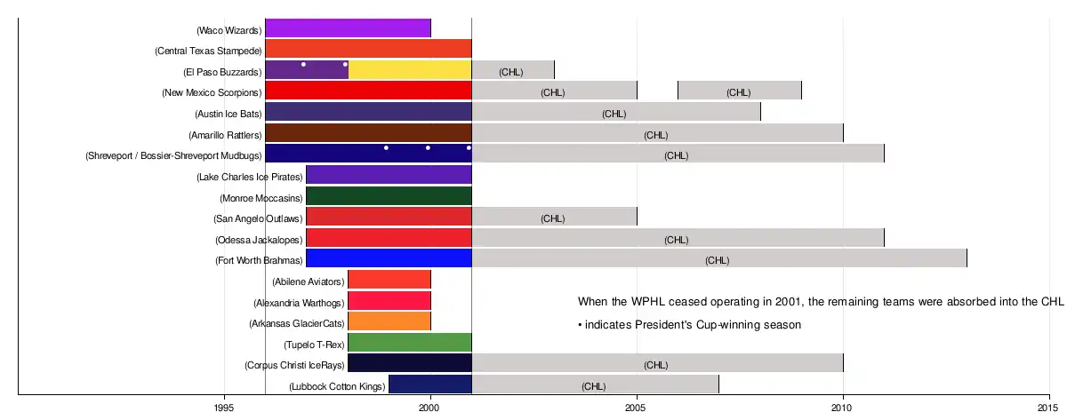 The WPHL operated from 1996 to 2001 with teams based in the southern United States, primarily Texas and Louisiana. The league started with six teams in the 1996–97 season and grew to 18 teams in 1999–00. After the 2000–01 season, the WPHL merged with the Central Hockey League.[2] Former WPHL teams continued to play in the CHL until the 2012–13 season.