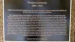 Western University was a historically black college (HBCU) established in 1865 (after the Civil War) as the Quindaro Freedman's School at Quindaro, Kansas, United States. The earliest school for African Americans west of the Mississippi River, it was the only one to operate in the state of Kansas.[1]