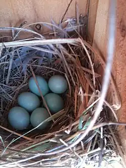 In restored forests, western bluebirds have a higher probability of successfully fledging young than in untreated forests, but they are at greater risk of parasitic infestations. The effects on post-fledging survival are unknown.[6] They have been found to enjoy more success with nest boxes than in natural cavities. They started egg-laying earlier, had higher nesting success and lower predation rates, and fledged more young in boxes than in cavities, but they did not have larger clutches of eggs. The eggs are commonly two to eight per clutch, with average size 20.8 mm × 16.2 mm (0.82 in × 0.64 in). Eggs are oval in shape with a smooth and glossy shell. They are pale blue to bluish-white and sometimes white in color. Nestlings remain in a nest about 19 to 22 days before fledging. In a good year, the parents can rear two broods, with four to six eggs per clutch. According to genetic studies, 45% of western bluebirds' nests carried young that were not offspring of the male partner. In addition, they help their parents raise a new brood after their own nest fails.