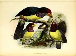The western yellow-billed barbet was formally described in 1863 by the Dutch army officer and ornithologist Andreas Leopold August Goffin (1837–1863) under the binomial name Capito goffinii. The specimens had been collected by Cornelis Nagtglas in the Dutch Gold Coast (now part of Ghana).[2][a] The western yellow-billed barbet is now placed with the eastern yellow-billed barbet in the genus Trachylaemus that was introduced in 1891 by the German ornithologist Anton Reichenow.[5] This species was formerly considered to be conspecific with the eastern yellow-billed barbet with the common name "yellow-billed barbet". The western yellow-billed barbet is now considered to be a separate species based on the differences in morphology and the deep mitochondrial DNA divergence.[5]
