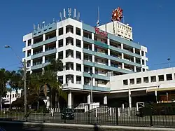 In early 2009, Sutherland Council approved plans to further upgrade the complex, which included demolition of the office tower and adding 100 additional speciality shops at a cost of $435 million. Myer lost its ground floor for a larger 'full-line' Woolworths supermarket.[18] The entrance has moved closer to the Kingsway and the centre expanded by approximately 19,000 square metres to 127,000 square metres of gross lettable area. Demolition of the areas around the office tower began in July 2013.[19] The star which sat on top of the tower was knocked off in late July 2013 as the office tower it sat upon was demolished. This caused anger amongst locals who wanted the star saved and incorporated into the new development.[20][21][18] However the fig tree located outside the centre on Kingsway was saved and incorporated into the development, with a team of landscape architects and arborists managing the health and habit of the tree.[12] This development did feature a new facade above the centre which is made up of grey wall which is designed to resemble fish scales in homage to "the Sutherland Shire's beach culture".[22]