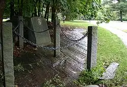 The current interpretation by those who advocate that the feature on the rock is a human figure is that it commemorates a fallen member of the party of Henry Sinclair, a Scottish Earl from Orkney, whom some believe to have made a voyage to the New World in 1398, traveling to Nova Scotia and New England.[7] According to Raymond Ramsey in 1972, the shield carried by the knight in the image was found to support this belief, when "English heraldic experts consulted by Lethbridge definitely identified arms on the shield as belonging to the Sinclairs of Scotland".[8] It has been suggested that the knight is Sir James Gunn, a member of Clan Gunn and a Knight Templar who reportedly traveled with Sinclair.[9] The monument next to the "knight" commemorates this interpretation, stating as fact that Sinclair and his party traveled to present-day Massachusetts. There is no evidence for this claim.[10] The claim was mentioned in an Encyclopedia of Dubious Archaeology in 2010.[11]