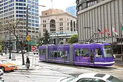 ![]() Pedestrian in Westlake Square watching South Lake Union Streetcar in 2010 | |