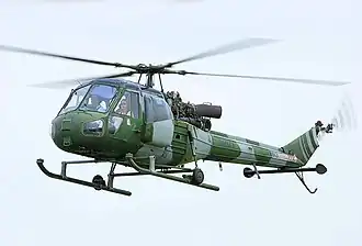 Behind the two front seats was a three-seat bench, although this could be replaced with a four-seat bench when fitted with modified rear doors. It was used for general light work, including observation, liaison, training and search & rescue. When fitted as a light attack helicopter, it carried either two, skid-mounted, forward-firing machine gun (L8A1 General Purpose Machine Gun) packs or a single pintle-mounted machine gun in the rear cabin.[4] The pintle mount was available in both port and starboard mountings.[5] The gun-packs, which were both aimed at a pre-set convergence angle, carried 200 rounds of ammunition and were mounted on a tubular spar that was fixed between the front and rear undercarriage legs.[6] In the anti-tank role, it could carry four guided missiles (the Nord SS.11).[7] The sighting unit was the AF.120, the result of a joint venture between Avimo and Ferranti, had x2.5 and x10 magnification.[8] The APX Bezu sight unit was also evaluated but rejected, although it was adopted for use on the Westland Wasp.