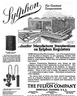 Following its sale in the late 1920s, the Fulton Sylphon Company operated as a subsidiary of the Reynolds Metal Company.[5] In 1947, several Reynolds subsidiaries merged to form Robertshaw Controls, and the Fulton factory operated as the Fulton Sylphon Division of this company for several decades.[5] In 1986, the British engineering firm Siebe purchased Robertshaw, and used the Fulton plant to manufacture car parts.[3] In the mid-1990s, Siebe began selling off its American holdings, and the Fulton factory was purchased by financier Robert Greaves.[3] Inspired by the factory's original owner, Greaves named the new company Fulton Bellows, which manufactures seamless metal bellows.[3]
