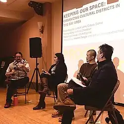 ![]() Left to right: Weston Teruya, Rachel Lastimosa, Tommy Wong, Erick Arguello; panel discussion Keeping Our Space: Organizing Cultural Districts in the Bay Area | |